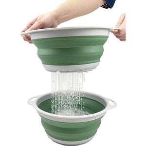 BPA-vrij. Gebruiksvriendelijk door eenvoudig openklappen voor het openen bij gebruik en ruimtebesparend in te klappen. Ruimtebesparend met uitgebreide afmetingen: 28 x 24 x 11 (h) cm en een hoogte van slechts 3,5 cm na het inklappen, bespaart meer dan 70% ruimte bij het opbergen. Uitstekend geschikt voor het bewaren van levensmiddelen, kamperen, wandelen en picknick. Perfect voor het zeefen, wassen en spoelen. Antislip bodem en gripvaste handgreep. Gat om op te hangen voor eenvoudig ophangen aan de muur