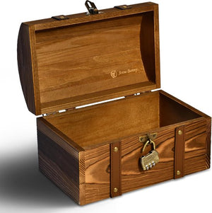EEN SPECIALE DRAAGBAARHEID? Dat is gewoon verkeerd en houdt niet vast. Deze schatkist bestaat uitsluitend uit natuurlijke en robuuste materialen, massief grenenhout. De schatkist met rond deksel is in waardevol handwerk gemaakt en naast zijn praktische gebruik als opbergkist zeer mooie decoratie. Afmetingen: 25 x 15,5 x 15,5 cm (l x b x h) en 1 cm wanddikte. Met het meegeleverde 3-cijferige combinatieslot kan de kist worden vergrendeld, de initiële combinatie 000 kan vrij worden gewijzigd. Je beste verrassing, of het nu gaat om een bruiloft, communie of doop: geef niet alleen geld, geef een schat cadeau. De kist is goed afgewerkt, stabiel en waardeert het cadeau nog eens duidelijk op. Iedereen is daar blij mee. Veilig bevestigd? Het hoogtepunt van de kinderverjaardag wordt het vinden van de schatkist. Maak het met deze schatkist tot een onvergetelijke ervaring en alle kinderen zullen er nog lang enthousiast over vertellen. Eenvoudig te gebruiken: Gemaakt met deze oude Japanse techniek, waarin het hout gericht wordt gevlamd om het duurzamer te maken en tegen weersinvloeden, schimmels en insecten te beschermen. Dit geeft deze schatkist de leuke antieke look en benadrukt de nerf.