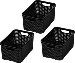 Set van 3 manden van hoogwaardige kunststof in rotan design in maat M Rotan design met kleine ventilatiegaten. Ideaal voor badkamer, keuken, werkplaats of kantoor. Voor de productie van onze producten gebruiken we alleen hoogwaardige BPA-vrije kunststoffen uit de EU Materiaal: BPA-vrij kunststof PP, afmetingen: 28,8 x 19,7 x 16,2 cm (l x b x h) Kleuren: zwart, hoeveelheid: 3 stuks