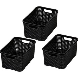 Set van 3 manden van hoogwaardige kunststof in rotan design in maat S Rotan design met kleine ventilatiegaten. Ideaal voor badkamer, keuken, werkplaats of kantoor. Voor de productie van onze producten gebruiken we alleen hoogwaardige BPA-vrije kunststoffen uit de EU Materiaal: BPA-vrij kunststof PP, afmetingen: 28,5 x 19,5 x 12,9 cm (l x b x h) Kleuren: zwart, hoeveelheid: 3 stuks