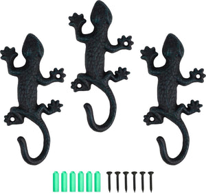 3 stuks Gecko garderobehaken, rustieke garderobehaken, gietijzeren wandhaken, vintage met schroeven, kledinghaken, muur om op te hangen, kleding, sleutels, hoeden, tassen, zwart-groen