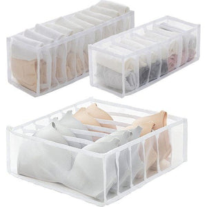 Speciaal vak: de ondergoed-organizers zijn voorzien van drie verschillende maten en meerdere vakken en zijn daarom bijzonder geschikt voor het opbergen van beha's, broekjes, stropdassen, sjaals en sokken. Sterke functionaliteit: het binnenste rooster is verhoogd en verbreed en de capaciteit is verbeterd, de driedimensionale structuur van de set is recht en deze opvouwbare beha-opbergdoos kan zonder vervorming onafhankelijk worden genomen. Wasbaar en opvouwbaar: de sokken- en beha-organizer is gemaakt van corrosiebestendige, hoogwaardige materialen voor een lange levensduur en heeft een stabiel opvouwbaar ontwerp, zeer eenvoudig in te stellen en kan ruimtebesparend worden ingeklapt wanneer deze niet wordt gebruikt. Hoogwaardige stof: de beha-opbergdoos is gemaakt van hoogwaardige stof, fijn net, fijne afwerking, zachte naden en