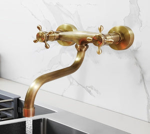 360° draaibare wandmontage keukenkraan, messing antiek dubbele hendel wandarmatuur retro wandkraan spoelbakarmatuur voor keuken zwembad badkuip