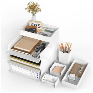 Desktop-bestandsopslag: de papierbakorganizer is zeer geschikt voor het opbergen van boeken, tijdschriften, brieven en A4-papier. Het is de eerste keuze voor het opbergen van desktopbestanden op kantoor en thuis en een goede assistent voor boekhoudwerkzaamheden. Extra bureau-organizerset 4-delig: naast de aktetas ontvang je een pennenbeker, een visitekaarthouder, een notitievak en een plank voor verschillende dingen. Een perfecte bureau-organizer is de beste keuze voor je kantooraccessoires. Eenvoudige toegang: deze brievenbakjes beschikken over kanalen, eenvoudig te monteren volgens je behoeften en de grootte van de ruimte, geen schroeven nodig. Schuif de vakken om snel het boek of het bestand te vinden dat je wilt.