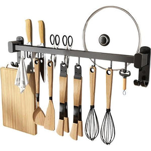 40 cm keukenhouder met 6 afneembare haken, aluminium messenhouder en potdekselhouder - keukenhulplijst - zwart