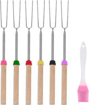 6 barbecuevorken, 1 roze olieborstel, telescopische barbecuespiesjes, roestvrijstalen stokken, barbecuestokken, intrekbare grillstokken, marshmallow grillstokken, geschikt voor kamperen, feest, tuin