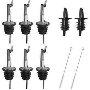 6 stuks roestvrijstalen schenktuit en 2 stuks rubberen schenktuit, olijfolie siroop azijn fles schenktuit, cocktail rode wijn champagne bierflesstopper, met 2 reinigingsborstels.