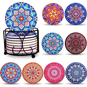 • 8 pakken levendige en kleurrijke onderzetters: bevat 8 onderzetters van keramieksteen in mandala-stijl. De zwarte ijzeren onderzetterhouder bergt je onderzetters op en bespaart ruimte.