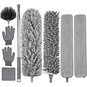 Effectieve reinigingsset: onze stofdoekset bevat 1 telescoopstang, 1 microvezel-stofdoekkop, 1 spinnennetborstel, 1 chenille-stofdoekkop en 1 reinigingsdoekjes van vezels, 1 naaiborstel, 1 reservedoek voor voegenborstels, 2 anti-slip reinigingshandschoenen Veelzijdig inzetbaar: de stofverzamelset is uitgerust met vier verschillende stofverzamelaars om ervoor te zorgen dat aan al je reinigingsbehoeften wordt voldaan. Ideaal voor het reinigen van stof tot huishoudelijke apparaten, ventilatoren, auto's, spinnenwebben of onder op gaten, meubels, jaloezieën, fotolijsten en hoeken, openingen of muren. Uittrekbare stofreiniger: met uittrekbare roestvrijstalen palen, praktisch voor het reinigen van stof en spinnenwebben binnenshuis of ramen, speciaal voor hoge ruimtes. In tegenstelling tot de korte versie kan de Super-Long Microfiber Duster tot 99 lang zijn om de diepe en hoge plekken te reinigen door het instellen van de stanglengte. Elektrostatisch adsorptiedesign: de krasvrije microvezel zorgt voor een effectieve stof- en vuilverwijdering en beschermt tegelijkertijd je reinigingsoppervlakken. Je kunt huishoudelijke apparaten, plafonds, jaloezieën, plafondventilatoren en verschillende meubels reinigen. Het flexibele ontwerp vergemakkelijkt het reinigen van de hoek of de bovenkant van de meubels. Gemakkelijk te reinigen en afneembaar: de kop van de telescopische stofzuiger is afneembaar en te reinigen. Na het reinigen van de ruimte hoef je alleen de draadstang tegen de klok in te draaien, de microvezelkop te verwijderen en de vezelborstel met warm water of weinig heet water af te spoelen. Na het natuurlijke drogen kan het worden hergebruikt voor eenvoudige opslag.