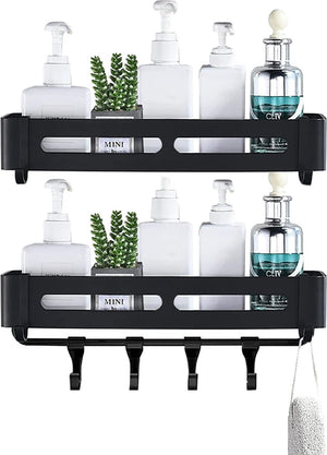 Badkamerplank zwart douchemandje en keukenopberger zonder boormachine. Roestbestendige aluminium badkamerwagen voor wandmontage met 8 haken (2 planken).