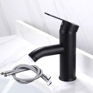 Badkamerwastafelkraan, zwart, eengreepskraan, badkamer, warm en koud water wastafelbatterij, roestvrijstalen kraan met toevoerslang, voor badkamer en wastafel op aanrecht, eenvoudige installatie