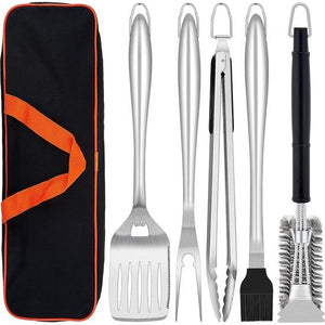 Basisbarbecue-accessoires: bevat grillspatel, grillvork, grilltang, nietborstel, grillborstel en draagtas. 6-delige barbecue-accessoires voldoen zeker aan je eisen voor verschillende barbecues. Geschikt voor de dagelijkse barbecue met familie of vrienden Hoogwaardige barbecue-accessoires: gemaakt van hoogwaardig, extra dik roestvrij staal, sterk genoeg om zware levensmiddelen moeiteloos en veilig op te tillen en om te draaien. De gematteerde en robuuste grillgereedschapsset breekt of buigt niet, is roestvrij en duurzaam in gebruik Barbecue-bestekset met lange handgreep: extra lange handgrepen zijn hittebestendig en beschermen je tegen brandwonden door hoge temperaturen of spatolie. De antislip achterkant van de handgreep is goed verbonden met zwart rubber en houdt comfortabel. Aan elke handgreep bevindt zich een groot ophangoog, eenvoudig op te hangen grillgereedschap in de keuken