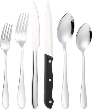 Service voor 6: Hoogwaardige bestekset bevat 6 steakmessen, 6 dessertvorken, 6 dessertlepels, 6 dinervorken, 6 dinerlepels en 6 dinermessen, essentieel voor gezinnen of restaurants, vaatwasmachinebestendig. Ons voordeel: kwaliteit en afwerking zijn talloze keren getest, gewicht en maat zijn ontworpen volgens ergonomische normen. Veel gebruikt: zeer geschikt voor dagelijks gezin, hotel, restaurant, entertainment, feest, buffet, bistro, camping, picknick.