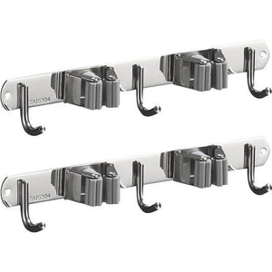 Bezemhouder muur, gereedschapshouder RVS met 2 houders en 3 haken, bezemsteelhouder, tuingereedschaphouder muur, muurbevestiging, bezemhouder voor badkamer, tuin, garage
