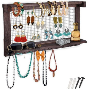 Wall-mounted jewellery organiser: organise your accessories with this beautifully crafted jewellery shelf. Hang your earrings on the wire wall, put your bracelets on the bracelet bar and hang necklaces on one of the 16 hooks at the bottom. So you can relax and place all your bracelets, bangles, watches, bands, cuffs and more and be sure that it is stable. EASY ASSEMBLY With the included mounting hardware, you can be sure that installing this jewelry organizer is a breeze even for a DIY rivet! 2 x 4cm screws and 2 anchors are already included, so you can have the shelf on your wall in no time. Convincing size: with the dimensions 43.18 cm x 25.4 cm and 16 storage hooks, this hanging jewellery cabinet fits perfectly in your living room, bedroom or anywhere you want to hang it.