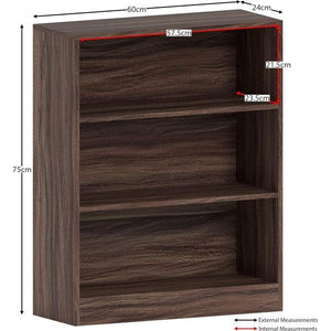 Cambridge Boekenkast met 3 niveaus, laag, walnoot, houten plank voor kantoor, woonkamermeubels