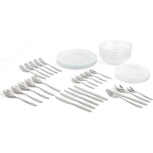 Samenstelling: Modern combinatieservies voor 6 personen, 18 delig (6 dinerborden 25 cm, 6 soepborden 20 cm en 6 dessertborden 19 cm) + 24-delig bestek van RVS breuk- en scheurweerstand; Vaatwasserbestendig; Temperatuurbestendigheid 100% hygiënisch Opaal is een poreus materiaal dat geen bacteriën afzet, zeer onderhoudsvriendelijk is enen vaatwasserbestendig
