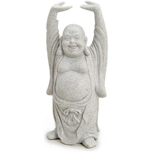 Decoratief beeldje Happy Boeddha beeldje staand in steen-look van polysteen grijs, 16 cm hoog, beeldje dikke monnik lachend, geluksboeddha Budai
