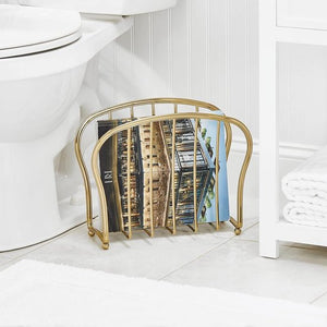 Decoratieve krantenhouder voor tijdschriften, boeken of tablets, vrijstaande tijdschriftenverzamelaar voor woonkamer of badkamer, elegante krantenmand van metaaldraad, messingkleuren