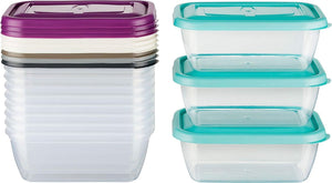 Je ontvangt 12 rechthoekige diepvriesdozen van 460 ml, elke doos is transparant. Elke doos heeft een deksel, de kleuren zijn turquoise, grijs, paars, wit en zwart in verschillende aantallen. Combineer onze verschillende varianten met elkaar. Deze vershouddozen zijn een nuttige keukenhulp om middelgrote hoeveelheden te vervoeren of vers te houden. Geef je kinderen brood mee of neem ze zelf mee naar het werk. Ook ideaal om kleinere hoeveelheden bijgerechten voor het grillen te serveren. Vries restjes in of houd ze vers in de koelkast, verwarm het in de doos zonder deksel en serveer ze direct met de container op tafel. Ook ideaal voor grotere hoeveelheden babyvoeding die je voorkookt en invriest. Combineer onze verschillende varianten met elkaar. Buitenafmetingen: 15,5 x 10,5 x 6 cm (l x b x h). Binnenafmetingen boven: 14 x 8,9 cm (LxB). Binnenafmetingen onder: 11x6cm (LxB). Bruikbare binnenhoogte: 5 cm. Inhoud: 0,46 liter. Kleur: kleurrijk. Temperatuurbestendig van -30 tot +110 graden Celsius. Vaatwasmachinebestendig. Magnetronbestendig zonder deksel. Niet geschikt voor de oven. Geschikt voor vriesvak. Materiaal: PP polypropyleen (BPA-vrij). Gemaakt in de EU.