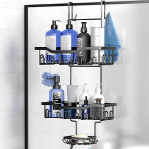 Doucheplank om op te hangen, 3-deurs doucheplank zonder boren, doucheplank, badrek, douchemand, hangend, shampoohouder, douchehangrek voor glazen deur, douchewand met zeepbakje en haak (zwart)