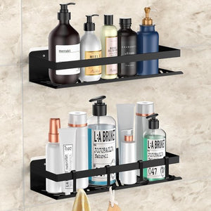 doucheplank zonder boren, 2 stuks roestvrijstalen douchemand met 4 haken, badkamerplank, roestvrije zwarte doucheplank voor badkamer en keuken. Laadvermogen ruim 15KG