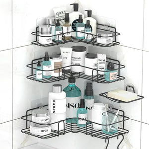 • Douchemandjes in verschillende maten - U ontvangt 3 verschillende maten hoekdouche-planken (groot: 26 × 26 × 6,5 cm, medium: 24 × 24 × 5,40 cm, klein: 24 × 24 × 1,96 inch), 1 zeepschaalhouder (5 cm) 11 × 3,54 × 1,57 inch) en 2 S-vormige haken (8 × 1,18 inch), 8 grote mappen, 1 kleine map in een verpakking. Geen boren nodig, eenvoudige installatie. De lijm is sterk, je hoeft je geen zorgen te maken dat de badkamermand gemakkelijk beweegt.