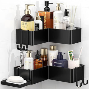 Doucheplank, zonder boren, roestvrij, zelfklevend, badkamerorganizer, hoek, doucheplank met 4 haken en zeephouder, duurzame shampoohouder voor douche van roestvrij staal, 2 stuks