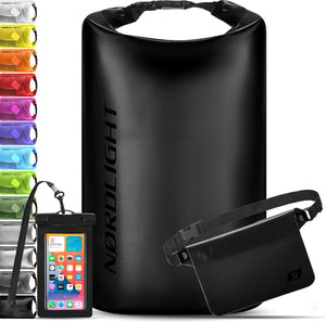Beschermt wat belangrijk voor je is: zomer, zon, waterschade, niet met Nørdlight! Je mobiele telefoon kan niet zwemmen, maar onze Drybags zijn wel. Voor 100% bescherming tegen water, zand en vuil, rol de sluiting 3-4 keer in en gesp de clips samen. Om de tas te laten drijven, laat hij gewoon lucht binnen. Onverslaanbaar trio: met onze set bestaande uit een waterdichte drybag, een heuptas en een smartphonehoes blijven al je waardevolle spullen droog en altijd goed bereikbaar. Je kunt kiezen uit 4 verschillende maten en tot 10 kleuren. Controleer onze maattabel om de juiste draagzak te vinden. Drybag: wij gebruiken een robuust, krasbestendig en naadloos pvc-zeil, dat (bijna) alles is gegroeid en toch superlicht is. Rol de roll-top-sluiting 3-4 keer in en gesp de clips samen. Om de tas te laten drijven, gewoon de lucht erin laten lopen. Telefoontas: dankzij de dunne pvc-folie kan het touchscreen probleemloos worden gebruikt. In de telefoonhoes kun je smartphones tot 17 cm waterdicht opbergen, evenals creditcards en kleingeld. Met de IPX8-standaard is hij tot 30 m onder water dicht.