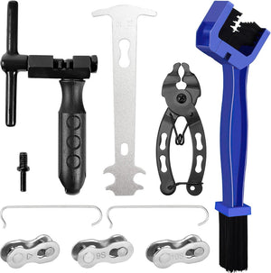 Reparatieset voor fietskettingen: wij bieden je een complete fietskettinggereedschapsset, met kettingklinknagels voor fiets, kettingschakeltang, 3-schakels fietskettingen, klinknagels (6-10s), kettingborstel en andere gereedschappen. Zo kun je je fietsketting zelf vervangen, instellen, repareren en reinigen. Hoogwaardige materialen: de fietskettinggereedschappen in de set zijn gemaakt van robuust, corrosiebestendig staal en hebben een glad, braamvrij oppervlak dat goed in de hand ligt. De kettingborstel is gemaakt van duurzaam kunststof voor de snelle reiniging van kettingvuil en de borstel is gemakkelijk te reinigen. Praktisch kettinggereedschap: de kettingklinknagel scheidt de ketting snel en wordt geleverd met een reserveonderdeel voor de meeste fietskettingen. De 2-in-1 kettingverwijderaar maakt het mogelijk om de fietskettang voor vervanging te openen en de fietskettang te openen om de ketting te vergrendelen om de reparatie te voltooien, wat je tijd en moeite bespaart. Meting van de kettingslijtage: wij leveren je een kettingmeter, waarmee je de slijtage van je fietsketting zelf kunt meten. Als de kettinglengte 0,75 bereikt, vervang deze dan zo snel mogelijk als hij 1,0 bereikt, vervang deze dan onmiddellijk. De 6-10 s fietskettingen klinknagels en kettinghaken die in de set zijn inbegrepen, helpen je om een snelle reparatie en vervanging te maken. Breed inzetbaar: de fietsreparatieset is een uitstekend gereedschap, dat onmisbaar is voor wielrennen buitenshuis en waarmee de meeste fietsproblemen kunnen worden opgelost. Geschikt voor racefietsen, sportfietsen, mountainbikes, stadsfietsen en andere fietsen. Wielersportliefhebbers mogen het in geen geval missen!