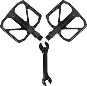 HOOGWAARDIGE MATERIAALPEDALEN: Onze pedalen zijn gemaakt van chroom-platina stalen kern, aluminiumlegering frame, eendelige aluminiumlegering anti-slip spikes die sterk, slijtvast en antislip zijn. MAAT & MAAT: de afmetingen van 105 x 91 x 18 mm bieden meer ruimte voor je voeten. De antislip spikes op het oppervlak van de voetensteun bieden voldoende grip om je voeten beter te houden, met uitstekende anti-slip en goede grip. Waterdicht en stofdicht: verzegelde lagers voorkomen effectief het binnendringen van water en stof, lekt niet gemakkelijk olie, je hoeft je geen zorgen te maken over rijden in zware regen, gemakkelijk schoon te maken, niet gemakkelijk te roesten. Veelzijdig toepasbaar: de standaard 9/16 inch spindel is geschikt voor de meeste modellen mountainbikes, racefietsen, fietsen met vaste versnelling, scooters, off-road fietsen enz. Eenvoudige installatie: lijn gewoon de gaten uit met de positie van de pedaalarmen en schroef vervolgens de pedalen met de klok mee op de juiste losheid, zeer eenvoudig te installeren.