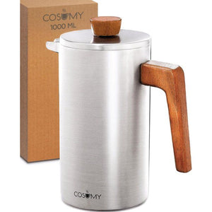 Serveer je koffie met stijl: met het elegante design van onze French Press maak je indruk op je gasten. Bouillon tot 6 kopjes met een grote inhoud van 1 liter. - Duurzaam en duurzaam: onze koffiepers van roestvrij staal en duurzaam FSC-gecertificeerd eikenhout met twee reservefilters zal je lang begeleiden. Koffie of thee langer warm: onze koffiepers is dubbelwandig geïsoleerd, zodat je langer van je warme drank kunt genieten. Perfect voor luie ochtenduren of als je gasten beheert. Optimale filtering: het filtersysteem van onze French Press scheidt koffiedik en vloeistof nauwkeurig van elkaar. Het resultaat is een heldere kop koffie - bij elk gebruik.