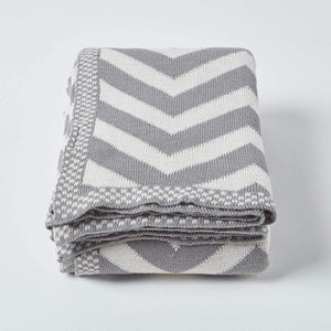 Gebreide woondeken voor bank of bed met geometrisch patroon. Afmetingen: ca. 150 x 200. Kleur: grijs en crèmewit.