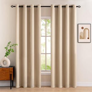 Deze superzachte en duurzame raamgordijnen maken gebruik van een speciale drievoudige weeftechnologie. De lichtdichte zwarte garens zijn tussen de twee gekleurde garens geweven om ervoor te zorgen dat de gordijnen ten minste 80% verduistering hebben (donkere kleurgordijnen werken beter). Onze verduisteringsgordijnen hebben aan beide zijden dezelfde kleur. Het materiaal is aangenaam zacht en valt goed De stof is mooi dik en verduistert de ruimte perfect. De kamer ziet er meteen veel huiselijker uit en nieuwsgierige blikken of te warme zonnestralen blijven veilig buiten. Onze gordijnen kunnen voorkomen dat je te vroeg door de vroege ochtendstralen wordt gewekt en zijn ideaal voor mensen die gevoelig zijn voor licht en gewend zijn om een dutje te doen in de lunch. Deze verduisteringsgordijnen zijn een waardevolle aanvulling voor je slaapkamer En in de zomer beschermt het ons tegen de hitte. Overdag dichtgetrokken blijft het lekker koel. Deze gordijnen kunnen in de winter koude wind afweren en voorkomen dat warmte door de ramen ontsnapt. Deze ondoorzichtige gordijnen kunnen ook in combinatie met transparante gordijnen worden gebruikt om de decorativiteit en functionaliteit te verhogen Je ontvangt twee ondoorzichtige gordijnen in beige, elk 225 cm hoog en 140 cm breed. Om een mooi plissé-effect bij het sluiten van de gordijnen te bereiken, moet de totale breedte van de gordijnen meer dan twee keer zo breed zijn als het raam. De gordijnen moeten langer zijn dan de afstand van de gordijnroede tot de onderkant van het raam. Als je de voorkeur geeft aan een hangend effect, waarbij de gordijnen de vloer raken, kun je langere gordijnen kiezen Verduisteringsgordijnen kunnen koud worden gewassen in de wasmachine op een fijnwasprogramma. Je kunt voor het ophangen op lage temperatuur strijken om de door de verpakking veroorzaakte vouwen te verwijderen, of je kunt ze direct wassen en ophangen. De in de productbeschrijving aangegeven gordijnlengte omvat het ooggedeelte aan de bovenkant van het gordijn. Meet vooraf de breedte en hoogte van het raam om het gewenste decoratieve en functionele effect te bereiken