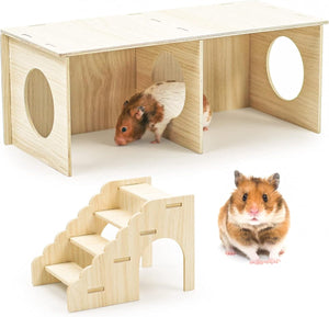Hamsterschuilplaats met trap: 2-kamer hamsterhuis van hout - grote schuilplaats ontworpen voor Syrische hamsters. De ingang heeft een diameter van ca. 8 cm, zodat je Syrische hamster er gemakkelijk in en uit kan komen. Afmetingen: ca. 36 x 16 x 14 cm. De trap helpt je hamster bij zijn dagelijkse beweging en spel. Opmerking: controleer voor aankoop of je kooi of kleine dier klaar is voor gebruik. HAMSTER HABITAT DECORATIE: Het is voor kleine dieren die graag graven of verbergen zich onder hamsterstrooisel of aarde, het is een geheime schuilplaats waar je gemakkelijk je kleine dieren en hun activiteiten kunt observeren zonder ze te storen, het zal plezier en avontuur toevoegen aan hamsters en bieden een leuke speelplaats voor je huisdieren Kooidecoratie: verrijkt het entertainment van je kleine dier. Je kunt bovenop het hamsterhuis trainen, slapen en spelen. Bovendien kun je er voederbakken, waterbakken, wielen of habitatdecoraties op plaatsen. Natuurlijk hout: dit hamsterhuis is gemaakt van hoogwaardig ecologisch hout. In vergelijking met ander speelgoed van dit type is ons product sterker en minder gevoelig voor schade. Het is veilig en milieuvriendelijk, niet giftig en geurloos, gezond en duurzaam. Elke hoek is glad geslepen, zodat je kleine lieveling gezond blijft en kauwbaar en duurzaam speelgoed heeft De perfecte speelruimte voor je hamster: het hamsterhuis kan worden gecombineerd met andere hamsterkooi-speelgoedsets om een perfecte speelplaats voor je hamster te creëren. Geschikt voor hamsters, gerbils, eekhoorns, muizen en andere kleine knaagdieren.