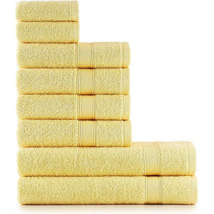 • 8-delige Nottoc handdoekenset in geel: bevat 2 grote badhanddoeken (70 x 140 cm), ideaal voor het lichaam, 4 handdoeken (50 x 90 cm), perfect voor het gezicht en de handen en 2 gastendoekjes (30 x 50 cm) voor bezoekers of kleinere behoeften. Een complete set voor je badkamer.