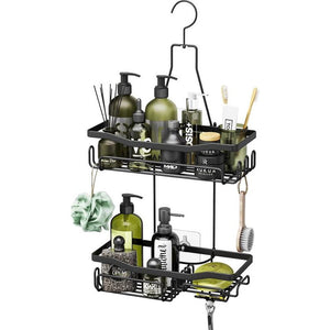 Hangend doucherek met scheerstandaard en zeephouder, doucherek om op te hangen met meerdere haken - Hoogwaardige douchemand om op te hangen, roestvrij staal, niet boren, zwart