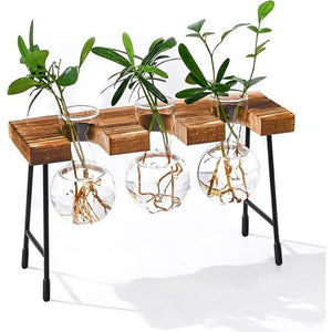 Hydrocultuur glazen vaas hangvaas bloemenvaas tafelvaas luchtplanten terrarium bureau decoratieve vaas met houten houder glazen plant voor kantoor huis tuin decoratie (3 vazen)