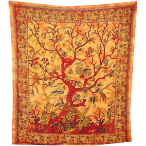 Indiase wandhanger, motief: levensboom, oranje, 230 x 205 cm, meerkleurig, vogels, bloemen, katoen, stijl tie-dye Indiase wandhanger, ontwerp: levensboom, oranje, 230 x 205 cm, veelkleurig, vogels, bloemen, katoen, tie-dye stijl.