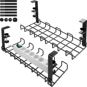 Kabelgoot bureaukit: het bureau-kabelmanagement bevat 2 x kabelmanagementtafel, 4 x kabelhouders en 6 kabelbinders die ons kunnen helpen om onze bureaus netjes en opgeruimd te houden. Eenvoudige montage, geen boren nodig: geen boren van gaten met schroeven of lijm nodig. De verstelbare clips kunnen aan bureaus (tot een dikte van 4,5 cm) worden bevestigd en zijn geschikt voor bijna elk bureau. Je hoeft je geen zorgen meer te maken dat het tafelblad beschadigd raakt. 【Hoge stabiliteit】De kabelgoot is gemaakt van sterk staal, wat betekent dat hij zware lasten kan weerstaan zonder te buigen. Belastbaarheid: 15 kg. De kabelgoot (43 x 12 x 13 cm) kan alle kabel- en stekkermaten bevatten en veel stopcontacten of draden bevatten. Open grid-design: het roosterontwerp maakt het mogelijk om kabels gemakkelijk te scheiden en opnieuw te leggen om stroom en apparaten overal aan te sluiten. Een maximale luchtstroom voorkomt oververhitting en vermindert de stofophoping.