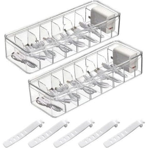 Kabelopbergdoos, 2 stuks kabelorganizerbox met deksel, 8 vakken met 30 kabelbinders, transparante kabelmanagementbox voor bureau, opslag, kantoor, thuisgebruik