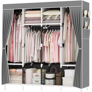 Duurzaamheid: de stoffen garderobekast is niet alleen functioneel, maar ook uiterst robuust. Het stevige metalen frame en de dikke canvasdoek maken het mogelijk om een aanzienlijk gewicht te dragen en veelvuldig gebruik te weerstaan. Daarom zijn ze bijzonder duurzaam en hebben ze een lange levensduur. Verschillende opbergmogelijkheden: in de regel bieden kledinggarderobe een groot aantal opbergmogelijkheden zoals laden en kleerhangers, die het interieur optimaal benutten. Daardoor kun je kledingstukken, schoenen, accessoires en meer netjes en ruimtebesparend opbergen. Een stoffen kledingkast zorgt ervoor dat je kleding altijd netjes en binnen handbereik blijft. Ja opbergorganizer. Praktische hoes: het deurgordijn kan moeiteloos met klittenbandsluitingen worden aangebracht, die het opgerolde gordijn veilig op zijn plaats houden. Multifunctionele kast. Door het gebruik van ritssluitingen kan de deur probleemloos worden geopend en gesloten, terwijl je kleding beschermd blijft tegen stof en vuil. Daarnaast voorkomen de banden het wegglijden van de hoes. Eenvoudige montage en demontage: de canvas-kledingkasten kunnen eenvoudig worden gemonteerd, rekken kunnen altijd naar behoefte worden aangepast of gewijzigd. De montage is eenvoudig en gemakkelijk uit te voeren. De kledingkaststof is gemaakt van duurzaam katoen en kan indien nodig probleemloos worden verwijderd en gewassen. Dit maakt de kledingkast niet alleen comfortabel en praktisch, maar ook onderhoudsvriendelijk.