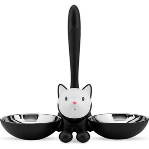 Kattenbak voor voer en water Materiaal: thermoplastische hars, roestvrijstalen kommen Afmeting: hoogte 28cm, lengte 16cm, breedte 16cm Beschikbare kleuren: zwart, grijs, geel