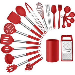 Keukengerei, 20-delige set met anti-aanbaklaag, siliconen keukengerei, hittebestendige kookgerei, keukenaccessoireset met gebruiksvoorwerpenhouder en roestvrijstalen handgreep, vaatwasmachinebestendig (rood)