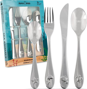 Kinderbestek Sea Animals – 4-delige set – kinderbestek roestvrij staal – bestek voor kinderen – eetbestek – vaatwasmachinebestendig – kinderbestek – kinderbestekset - voor kinderen vanaf 3 Koru Kids