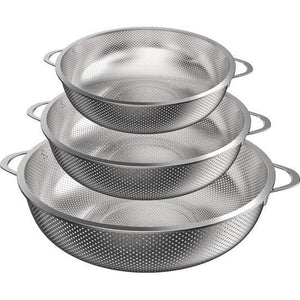 Premium stainless steel - The 3-piece strainer stainless steel kitchen set is made entirely of food-safe stainless steel, is non-toxic and rustproof. The robust construction does not bend, stretch or get stuck even under heavy food. Stain, odor and heat resistant compared to plastic strainer, healthy and durable for daily kitchen use. EXTREMELY VERSATILE - With the micro-perforated holes of 2mm diameter, you can literally use the kitchen strainer for any type of food. Get rid of excess water and oil from your pasta in seconds or clean your potatoes, tomatoes, berries and any other vegetables and fruits effortlessly. In addition, you can use this kitchen accessory as a work container, plate or display stand to save space HEAVY DUTY HANDLES - D-shaped handles are firmly welded to make lifting and transporting easier. They allow you to place this strainer in a mixing bowl for draining. They can also be used as hanging hooks during storage, which helps to save space and tidy up your kitchen countertops. 3 small feet - Three 0.4 inch feet keep the strainer stable and drain the water from pasta or vegetables when placed in the sink. The extra height of the feet also improves hygiene when preparing or serving. Lightweight and easy to use storage. DISHWASHER SAFE - When you're done using our strainer, all you need to do is put it in the dishwasher for quick and perfect cleaning. If you don't own one, simply place this large strainer under running water for a few seconds and use it again immediately!