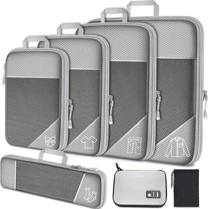 7-delige organizerset: Sorteer uw spullen op een georganiseerde manier met deze verpakkingskubusset. Kleur grijs. Deze 7-delige set bevat meerdere maten compressiekubussen met verschillende functies: extra groot (40 x 40 x 9 cm), groot (30 x 40 x 9 cm), medium (25 x 35 x 9 cm), klein (25 x 35 x 9 cm), klein (25 x 35 x 9 cm). 0 x 30 x 9 cm Slank (35 x 10 x 9 cm) Tas met trekkoord (47 x 35 cm) Elektronische opbergtas (23,5 x 16,5 cm) Ruimtebesparende reisuitrusting: deze verpakkingskubussen verminderen de benodigde ruimte aanzienlijk en maken het inpakken een fluitje van een cent. De compressiekubussen hebben dubbele ritsen, zodat kleding gemakkelijk kan worden samengedrukt, waardoor de ruimte in uw handbagage of ingecheckte bagage wordt geminimaliseerd. Deze organisatoren met ritssluiting kunnen nog eens 50% ruimte besparen, waardoor u de grootte van uw handbagage kunt verkleinen en er meer spullen in kunt opbergen. Ook perfect om kleding in huis op te bergen en alles op orde te houden.