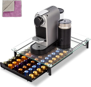 Grote capaciteit: deze capsulehouder kan tot 60 koffiecapsules bevatten. Het kan koffiecapsules, theezakjes, chocoladerepen, melkcapsules enz. met een afmeting van niet meer dan 4,5 cm (H) x 5 cm (B) bewaren. Eenvoudig beheer en opslag van je koffiecapsules. Houd je capsules netjes en niet meer rommelig. HOOGWAARDIG MATERIAAL: speciaal ontworpen voor Nespresso, met gebruik van hoogwaardig 5 mm dik gehard glas en metalen materialen, het oppervlak van het metaal is bespoten, waterdicht en roest niet. Zorg voor een lange levensduur van onze koffiecapsulehouder. EENVOUDIG BIJ VULLEN: De transparante glasplaat verbetert de esthetiek en is gemakkelijk schoon te maken, en de glazen afdekking maakt het mogelijk om de status van de capsules op elk moment te zien, zodat u in één oogopslag de resterende hoeveelheid koffiecapsules kunt zien. U kunt op tijd bijvullen. Houd er rekening mee dat het glasmateriaal tijdens het transport kan barsten, open de verpakking voorzichtig en neem tijdig contact met ons op om het voor u te vervangen. GEMAKKELIJKE TOEGANG: Onze capsule-organizer lade heeft een push-pull-ontwerp, de lade glijdt gemakkelijk, zodat u gemakkelijk de juiste koffiecapsule kunt kiezen. Met deze koffiecapsulehouder hoef je je geen zorgen meer te maken dat je de binnenste koffiecapsule er niet meer uit krijgt. Stuur 1 microvezeldoek. Ruimtebesparend: deze compacte Nespresso capsulehouder is 6,5 cm hoog, 30 cm lang en 40 cm breed, de capsulehouder kan als basis voor je machine worden gebruikt, of kan koffieglazen plaatsen zodat hij nauwelijks extra ruimte inneemt. Daardoor kan de ruimte in de keuken optimaal worden gebruikt. Zeer aangenaam. De koffiecapsulelade is ideaal voor koffiekeukens, koffiebars, koffiefeesten, theekeuken, koffielounges en kantoorkeukens.