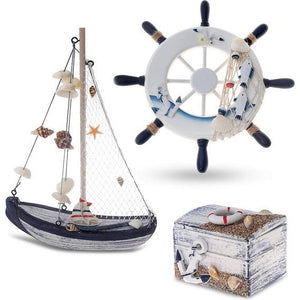 Maritieme badkamerdecoratie set van 3 - stuurwiel, zeilschip en schatkist van hout - liefdevol vormgegeven badkameraccessoires met details (design 2-2)