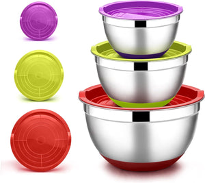 Mengkomset, 3-delige roestvrijstalen kom met luchtdicht deksel en antislip bodem, slakomset voor keuken/bakken, koken/bereiding, vaatwasmachinebestendig, 4,6 l/2,8 l/1,2 l